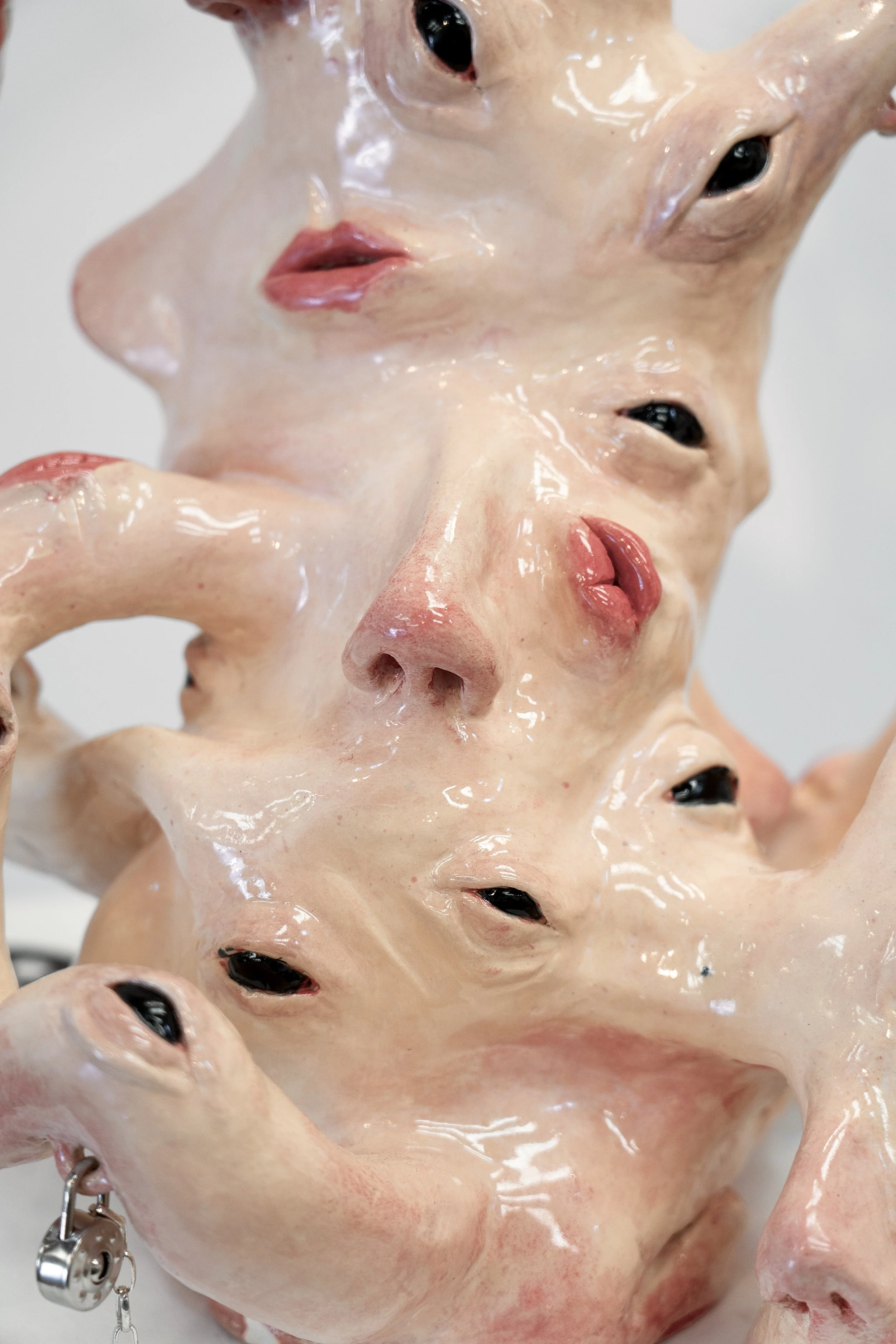 The flesh face that I made at the end of last year. It’s a bit extravagant, and it’s got those pearls hanging from it. It was the first time I’ve ever done those weird melty flesh things. I was first making a vase that was cylindrical, then it started flopping. So I added these weird legs. Kind of